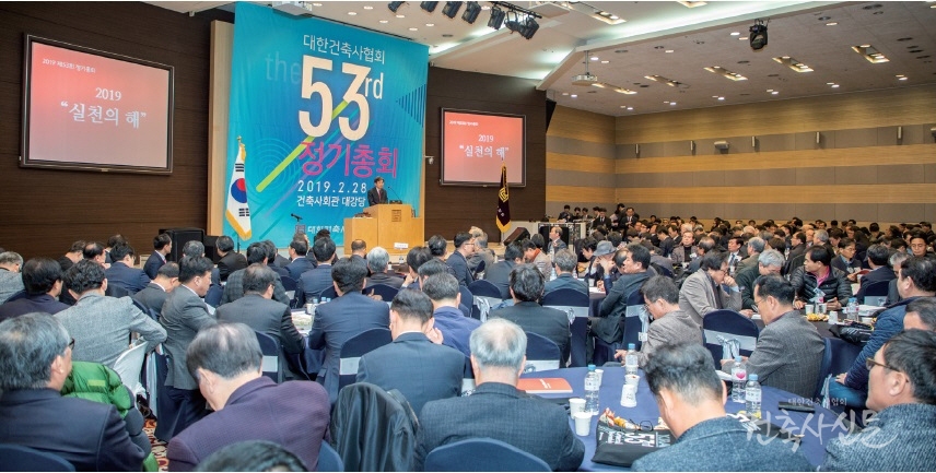 대한건축사협회는 2월 28일 서울 서초구 건축사회관 대강당에서 대의원 412명이 참석한 가운데 제53회 정기총회를 개최했다. 총 5개 안건을 상정하고 ▶법·제도개선 ▶연구개발(R&D) ▶미래인재 육성 ▶사회공헌 ▶대국민홍보 등을 핵심으로 하는 2019년도 실천계획과 예산안을 의결했다.