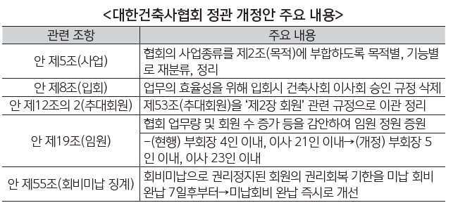 특히 이날 통과된 정관 개정안은 정부정책과 건축 환경 변화에 협회가 능동적이고 선도적으로 대처하기 위해 재해, 재난 대비 상설기구 설치의 근거를 마련하고, 국민의 안전 확보와 건축사의 사회적 책임을 강화하는 일환으로 추진됐다. 정관 개정안에 따르면, 입회 시 건축사회 이사회 승인조항을 삭제하고 회비 미납 권리정지의 경우, 미납회비를 완납하면 즉시 입회할 수 있도록 하는 등 회원 서비스 증대와 회원의 협회 참여기회를 확대할 수 있도록 관련 규정을 개선했다.