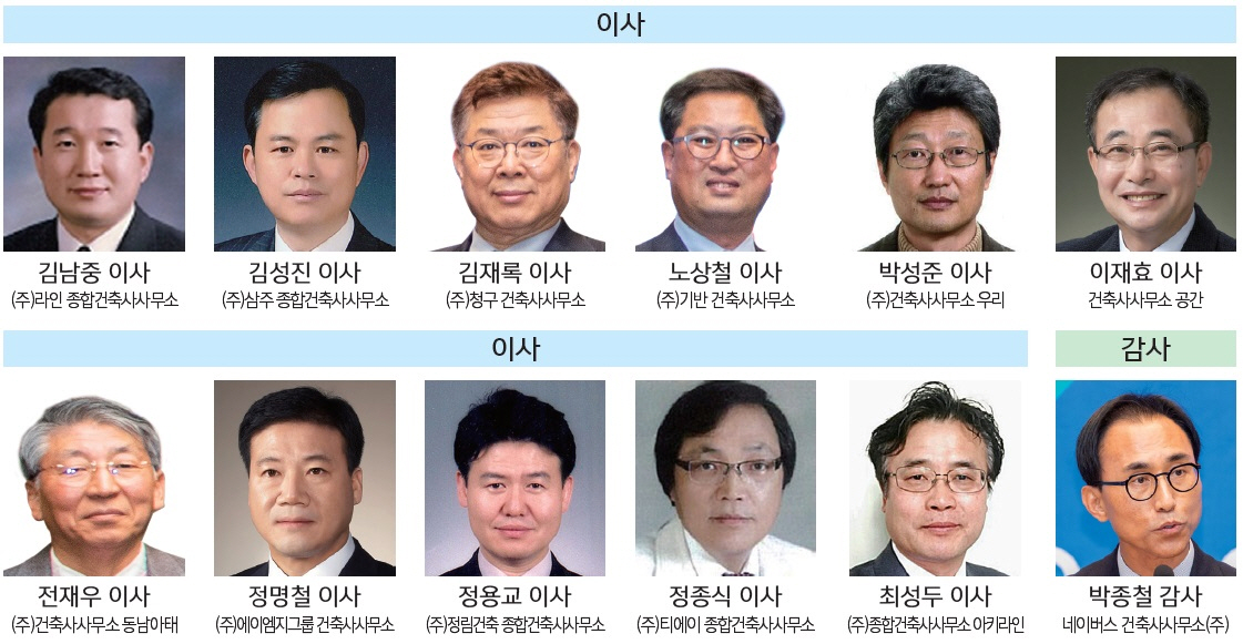 신임 이사로는 김남중(주.라인 종합건축사사무소), 김성진(주.삼주 종합건축사사무소), 김재록(주. 청구 건축사사무소), 노상철(주.기반 건축사사무소), 박성준(주.건축사사무소 우리), 이재효(건축사사무소 공간), 전재우(주. 건축사사무소 동남아태), 정명철(주.에이엠지그룹 건축사사무소), 정용교(주.정림건축 종합건축사사무소), 정종식(주. 티에이 종합건축사사무소), 최성두(주. 종합건축사사무소 아키라인) 건축사 등 총 11인이 선출됐다. 정관 개정안이 통과됨에 따라 추가 선출되는 이사 2인은 정관개정안이 국토교통부장관으로부터 인가되면 인가되는 시점부터 임기가 개시되는 조건으로 회장에게 위임하기로 했다.