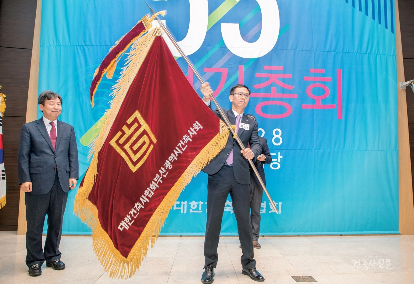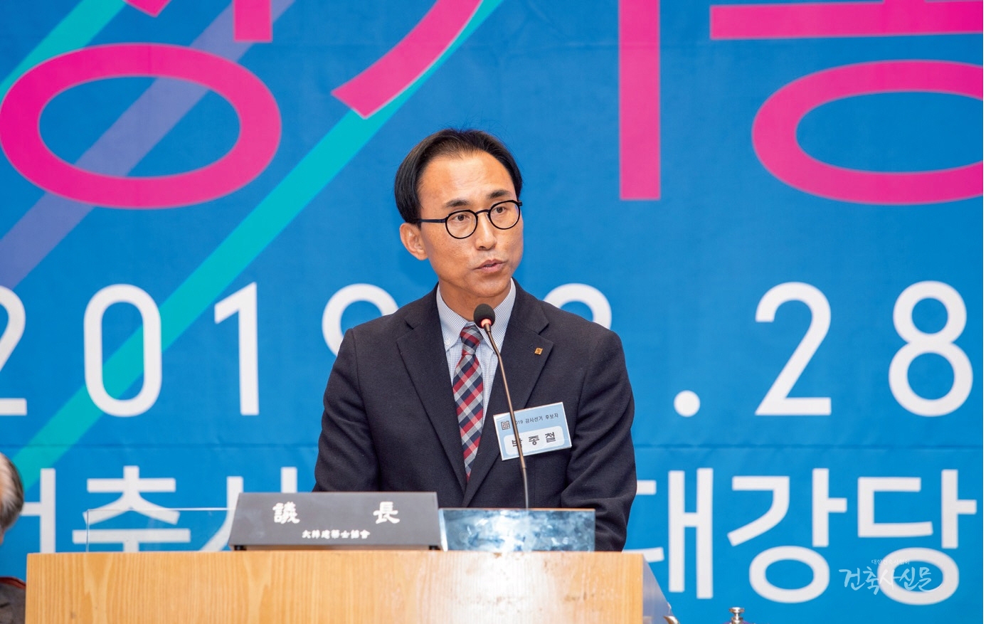 "디지털기술혁명시대를 맞이해 건축산업의 진흥을 도모하기 위해서는 건축계가 합심하여 건축의 경계를 넘어서는 지혜를 발휘해야 할 것입니다. 앞으로는 우리 시대의 거울로서 인간의 정주환경을 창조하는 건축 본연의 역할을 확장하여 도시재생, 시설물 유지관리, 스마트 도시 건립 등의 새로운 업역에도 적극적으로 진출할 필요가 있겠습니다. 우리 스스로의 자성과 성찰을 통해 건축의 대국민 이미지를 개선하고 건축인들의 생존보장과 권익신장을 위해 함께 노력해야 겠습니다. 우리 건축인 모두 일치 단결하여 역경을 이겨내면서 미래 건축산업을 선도해 나가도록 합시다."