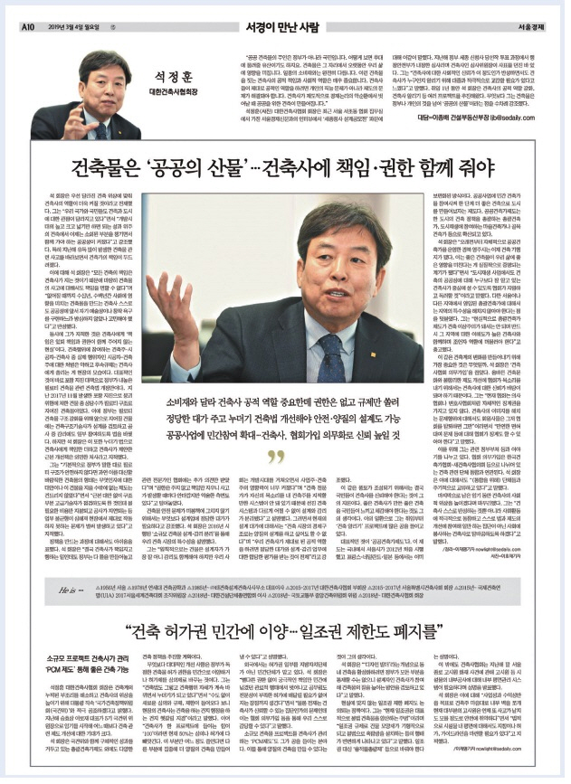 3월 4일자 서울경제신문에 석정훈 대한건축사협회장의 인터뷰 기사가 게재됐다. “건축물은 ‘공공의 산물’…건축사에 책임·권한 함께 줘야”라는 제목의 기사로 석정훈 건축사협회장은 ▲필로티 형식 건축물 관련 건축법 개정안 문제 ▲건축사에 대한 정당한 대가 지급 필요성 ▲건축사협회 의무가입 등을 강조했다.