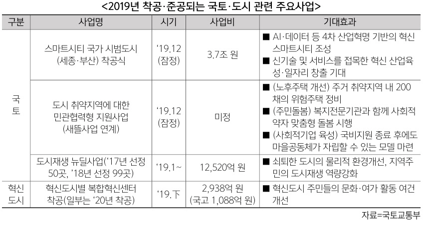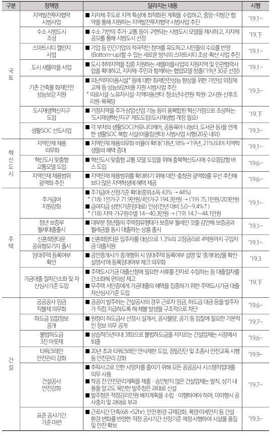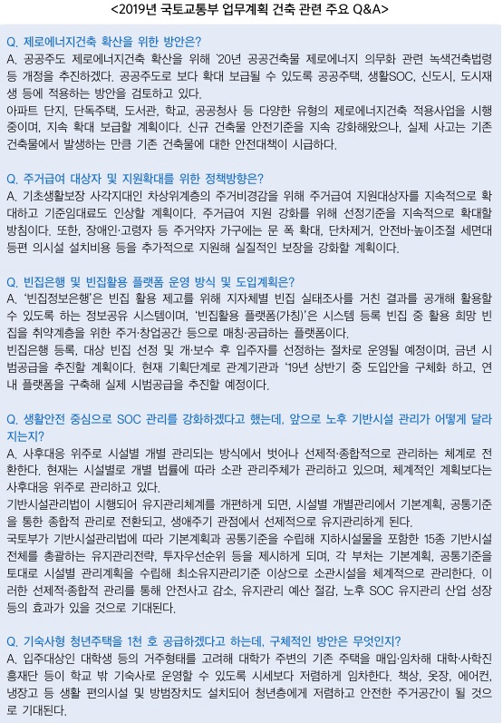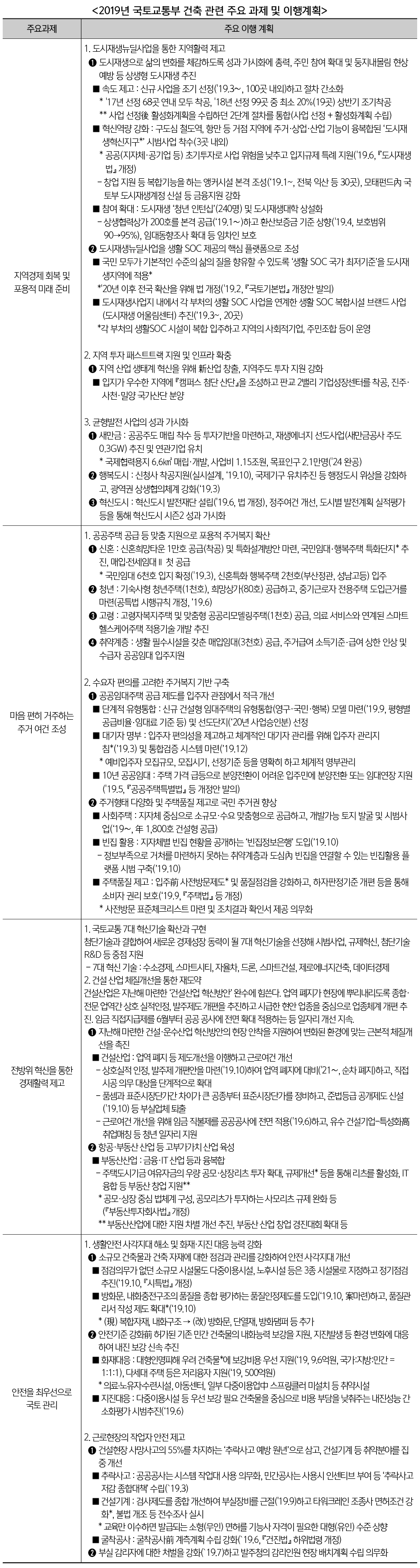 국토교통부가 소규모 건축물과 건축자재 점검 및 관리를 강화해 안전 사각지대를 개선하고, 부실 감리자에 대한 처벌을 강화하며 발주청의 감리인원 현장배치계획 수립을 의무화한다. 또한 옛 도심의 도시재생을 촉진하고자 ‘도시재생혁신지구’를 도입하고. 도시재생뉴딜사업에 속도를 붙여 올해 신규 사업을 조기에 선정하고 신청 절차를 간소화하기로 했다.