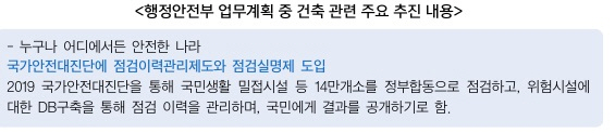 또한 행정안전부는 3월 11일 정부서울청사에서 브리핑을 갖고 국가안전대진단에 점검이력관리제도와 점검실명제를 본격 도입한다는 내용을 담은 올해 업무계획을 발표했다. ‘2019 국가안전대진단’을 통해 국민생활 밀접시설 등 14만개소를 정부합동으로 점검하고, 위험시설에 대한 DB구축을 통해 점검 이력을 관리, 국민에게 결과를 공개한다는 방침이다.