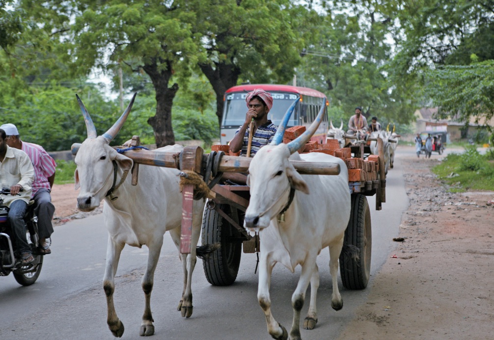 호스펫(Hospet, India)에서 릭사를 전세 내 함피로 가던 중 잠시 쉬며 차이인도의 국민차)를 마시고 있는데 흰 소 두 마리가 끄는 마차가 지나간다. 벽돌을 잔뜩 싣고 어디로 가는 것일까? 인디아의 길거리에서 자주 소를 만나는데 짐을 나르는 모습은 처음이다. 마차 뒤로 보이는 작은 버스와 오토바이를 타고 가는 사람들이 렌즈에 들어온다. 마치 영화의 한 장면을 보는 듯하다. 진풍경이다.
