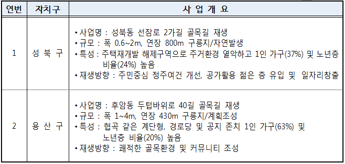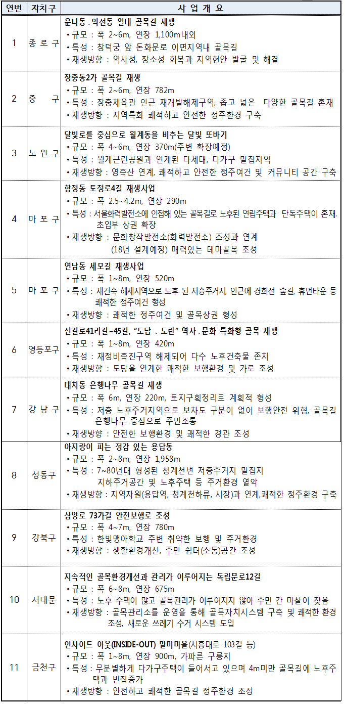 서울시는 시범사업 추진 중인 용산·성북구 골목길을 제외한 11곳이 2021년 준공을 목표로 연내 공사에 착수한다고 밝혔다. 사업지별로 3년간 총 10억 원 규모의 마중물 사업비를 지원하고, 시·구의 각 분야별 사업과 연계해 재원을 추가 집중 투자한다는 것. 또 5월 중에는 자치구 공모를 통해 12곳의 골목길을 추가로 선정할 예정이다.