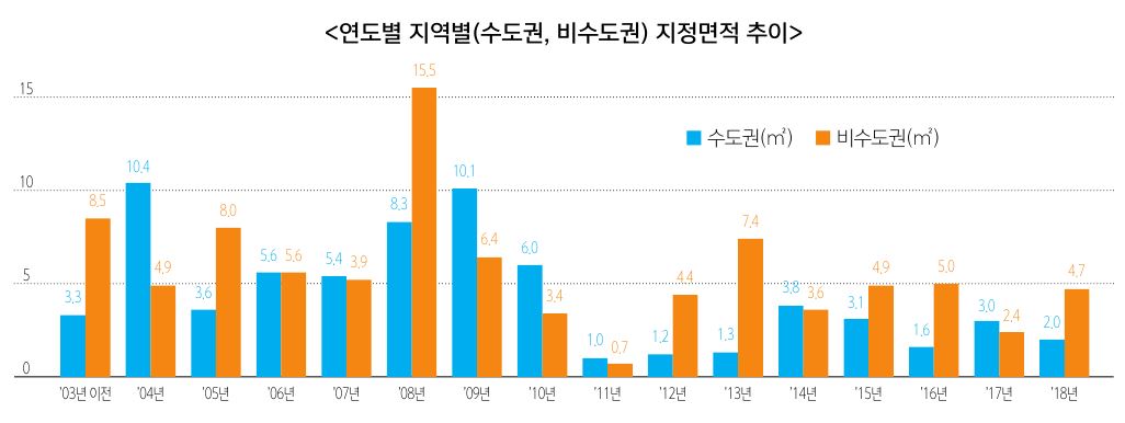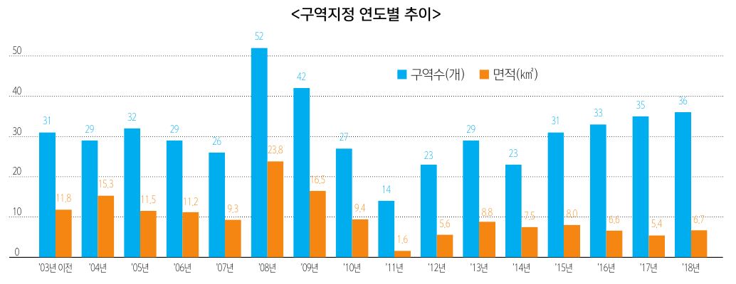 지난해 신규 지정은 수도권에서 경기도가 14개 구역, 1.44제곱킬로미터를 지정해 전국 신규 지정 건수(36개)의 38.9%를 차지했다. 비수도권 지역에서는 총 22개 구역, 4.73제곱킬로미터가 신규 지정돼 최근 지정 감소 추세에서 벗어나 지정 면적이 크게 증가했다.