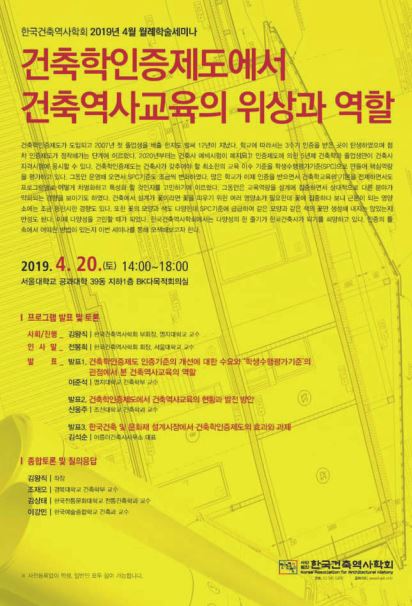 한국건축역사학회(회장 전봉희)가 4월 20일(토) 14시부터 18시까지 서울대 공과대학 39동 지하1층 BK다목적회의실에서 ‘건축학인증제도에서 건축역사교육의 위상과 역할’을 주제로 월례학술세미나를 가진다.