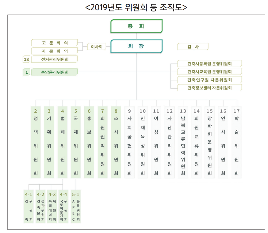 올해 운영되는 상설위원회는 총 18개다. 기존의 ‘50년사발간위원회’가 폐지되고 ‘학술위원회’가 신설됐다. ‘건축사등록원운영위원회’와 ‘건축사교육원운영위원회’, ‘건축연구원자문위원회’, ‘건축정보센터자문위원회’ 등 4개 위원회는 별도의 운영규정에 따라 구성됐다. ‘대한민국건축사대회조직위원회’와 ‘한국건축산업대전집행위원회’, ‘서울국제건축영화제 집행위원회’ 등 3개 위원회는 협회 주요 행사를 담당하게 된다. 이밖에도 ‘건축문화대상시행위원회’나 ‘FIKA’ 등과 관련된 6개 위원회가 별도로 구성됐다.