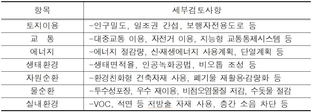 이번 지침은 기존 개별 아파트 단지, 건축물에만 적용하던 친환경 건축기법을 도시개발지구 전체로 확대 적용할 수 있도록 한 종합적인 친환경 건축 기준으로 에너지 효율, 일조권, 친환경 자재, 녹지, 자원순환 등 7개 분야 41개 항목의 평가항목으로 구성됐다.