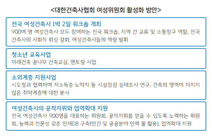 이날 대한건축사협회 여성위원회는 위원회 활성화를 위한 조직과 정책에 대한 청사진도 발표했다. 여성위원회는 위원장 1인, 부위원장 2인, 전국 17개 시도별 위원 17인으로 구성하고, 지역 간 교류 및 소통창구 역할과 여성건축사들의 역량 확대를 위해 900여 명의 여성건축사회원이 모두 참여하는 ▲전국 여성건축사 1박 2일 워크숍 개최, 미래 건축꿈나무 건축교실 등 ▲청소년교육사업, 전국 지자체와 협력하여 시행하는 ▲소외계층 지원사업 ▲여성건축사의 공적지위와 업역확대 지원을 추진하기로 하며, 향후 활동에 기대를 품게 했다.
