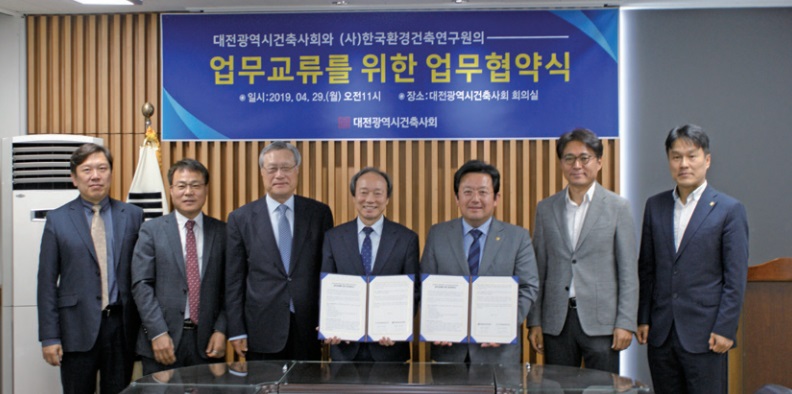 대전광역시건축사회는 (사)한국환경건축연구원과 4월 29일 대전광역시건축사회 회의실에서 ‘업무협약(MOU)’을 체결했다고 밝혔다.