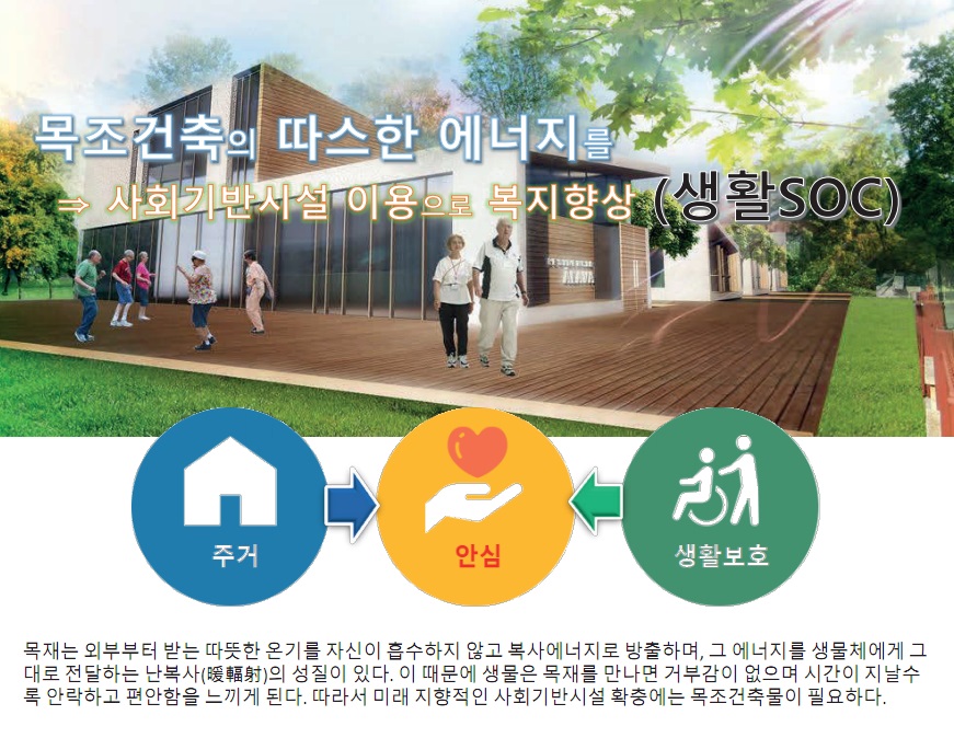 지난 4월 15일 정부는 국가최소기준에 못 미치는 서비스 소외지역에 대해서 국민의 삶의 질을 높이고, 균형발전·일자리 창출 등을 위해 ‘생활SOC 3개년계획(안)’을 발표한 바 있다. 유명 의학저널 LANCET에 발표된 우리나라를 세계 최장수국가로 지목한 논문에 걸맞는 복지정책이다. 생활 SOC(사회기반시설 Social Overhead Capital)란 사람들이 먹고, 자고, 자녀를 키우고, 노인을 부양하고, 일하고 쉬는 등 일상생활에 필요한 인프라와 삶의 기본을 전제로 하는 안전시설을 의미한다. 정부는 문화·체육시설 및 정주여건을 위한 기초인프라 확충, 돌봄과 공공의료시설 확충, 안전하고 깨끗한 생활환경 조성을 위해 3년간 48조 원을 들인다고 한다. 그 배경은 취약한 생활 인프라로 사회에서 소외되었던 취약계층에게 국민소득 3만불 시대에 맞는 삶이 되도록 쾌적한 시설 환경을 마련하여 생활의 질을 끌어올리는 데 있다. 그 대상은 당연히 정상인보다 신체가 불편한 노약계층이 우선될 것이다. 이들은 사회적으로 외롭고 고달픈데, 손발이 시리고 몸이 춥고 아프기 때문에 신체적으로 소외감을 느끼고 정신적으로 서러움에 시달린다고 한다. 노약자는 추워지면 심장에서 보내는 피가 신체말단까지 잘 통하지 않아 시설물이나 주변에 차가운 것을 두는 것이 싫다. 그래서 복지선진국에서는 이들을 위한 시설물에 열전달이 잘되는 쾌적감이 좋은 건축 재료를 우선적으로 사용한다. 시설물에 치유와 소생의 힘을 빼앗기지 않도록 하는 배려 차원에서 대부분이 목재를 이용하고 있다. 목재는 외부부터 받은 따뜻한 온기를 자신이 흡수하지 않고 복사에너지로 방출하며, 그 에너지를 생물체에게 그대로 전달하는 난복사(暖輻射)의 성질이 있다. 이 때문에 생물은 목재를 만나면 거부감이 없으며 시간이 지날수록 안락하고 편안함을 느끼게 된다. 반면 콘크리트는 생물체로부터 열을 빼앗아 간다. 한 여름철에도 지하실에 들어가면 으스스함을 느끼는 것도 이와 무관하지 않다. 사람의 체온이 1℃ 올라가면 체내 대사율이 높아지면서 면역력이 5배가 증가한다는 보고가 있다. 또 목재의 냄새는 스트레스를 긍정적으로 변환시키는 효과가 있다. 거동이 어려운 노약자는 실내에 머무는 시간이 정상인보다 훨씬 길다. 노약자를 위한 시설물에 목재를 많이 사용했으면 좋겠다. 세계 최장수 국가로 가는 미래 지향적인 사회기반시설 확충에 목조건축이 필요하다. 유치원, 어린이집과 공공의료시설도 예외일 수는 없다. 이미 세계적으로 목재를 초고층 건축재로 이용하는 녹색건축물이 급증하고 있다. 참고로 일본 정부의 경우, 「공공건축물의 목재이용 촉진법」으로 생활SOC에 해당하는 이와 같은 공공체육시설, 도서관, 문화예술교육터, 생활문화센터, 복합커뮤니티센터, 유치원, 어린이집, 초·중·고등학교 시설, 노인요양시설, 주민건강센터, 지하철역사, 버스터미널 등의 축조에 목재를 우선적으로 적용하고 있다.