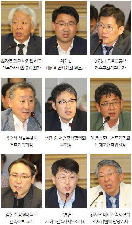 이에 대해 토론자로 나선 원영섭 대한변호사협회 변호사도 “제도적으로 징계가 이뤄지지 않는 이유는 수사과정에서 입증하기 어려워서다. 임의가입으로 징계를 당하지 않기 위해 빠져나온 사람, 즉 악인이 승리하는 구조가 지금 시장의 현실이다. 업계 자정노력으로 제대로 된 징계를 위한 법정의무단체 및 건축사에 대한 인식제고 프로그램이 실행돼야 한다”며 건축사 스스로 자정하는 과정이 필요하고, 이를 위해선 제도보완이 필수임을 강조했다.