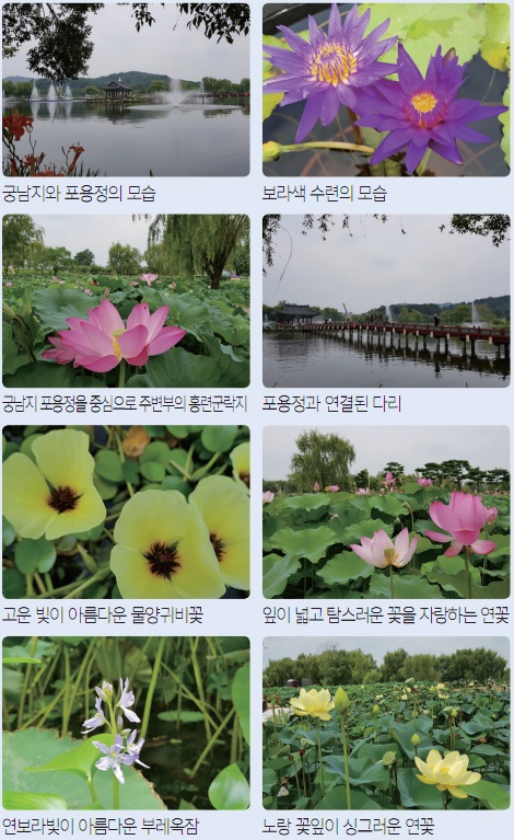 궁남지에는 잎이 넓고 꽃이 탐스러운 연꽃들과 물 위에서 이쁘게 피는 수련들과 어리연꽃, 물양귀비, 꽃창포 등이 가득하다. 톱니 잎을 내보이는 왜개연, 남개연 등도 볼거리다. 물속에는 논병아리들도 새끼들과 노니는 모습을 발견하는 것도 재미가 쏠쏠하다.