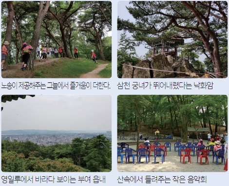 산책길 주변으로는 역사를 간직한 건물들과 흔적들이 남아있다. 자세히 공부하지 않고도 숨결을 느끼면서 잠시 휴식만 하여도 좋은 것이 이곳을 산책하는 방법이다. ‘인빈출일’이라는 글귀의 현판이 걸려 있는 영일루는 삼가 공경하면서 해를 맞이한다는 의미의 건축물이다. 여름 녹음으로 보이지는 않지만 정림사지의 웅잠함도 느껴지는 위치에 오르면 잠시 땀을 식혀 갈 수 있는 곳들도 있고, 그늘아래 옛 소리를 들려주는 공연도 시작한다.
