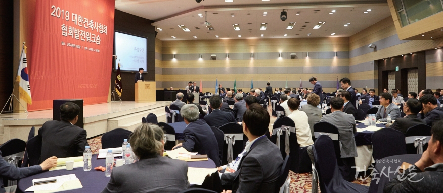 대한건축사협회는 5월 16일 오후 서울 서초구 대한건축사협회 대강당에서 ‘2019 협회발전워크숍’을 개최됐다. 같은 날 오전 열린 ‘건축사 재난안전지원단’ 발대식에 이은 2부 행사다.