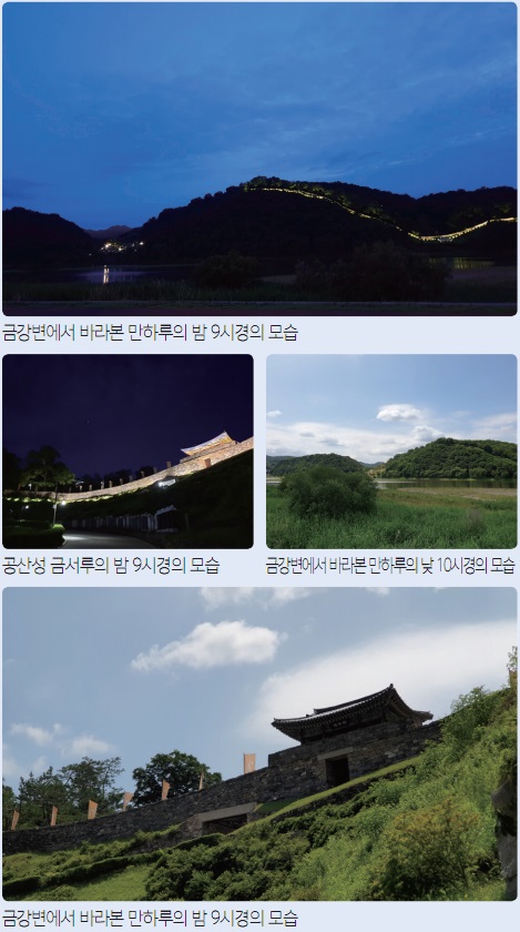 밤이 깊어갈수록 공산성의 성곽의 모습이 아름답게 비춰진다. 전날 비가 온 후 구름과 달빛이 겹쳐 금강에 비춰진 누각이 더욱 멋스러웠다. 성곽의 조명이 점형으로 보인 것이 자연구릉위에 세워진 성곽의 흐름을 방해하는 것 같아 다소 아쉬웠다.