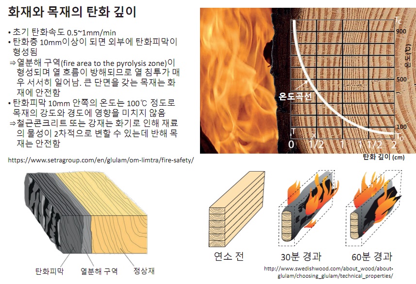 목재로 된 새시, 알루미늄 새시, 철제 방화문의 새시… 어느 것이 화재에 가장 잘 견디었다고 생각하세요? 정답은 목재 새시다. 우리는 일반적으로 목재는 불에 타기 때문에 화재에 취약하다고 알고 있다. 이 때문인지 화재 현장의 뉴스에도 항상 목재가 화마의 원인인 것처럼 보도되고 있다. 그런데 목재가 불에 약하다는 것은 잘못된 생각이다. 오히려 화재로부터 생명이나 재산을 지키는 것이 목재다. 목조건축은 화재 현장에서 피난 시간을 확보하는데 절대적으로 유리하다. 목재는 불에 타지만, 타는 것은 목재의 표층이지 내층까지는 타는데 오랜 시간이 걸린다. 목재 표면이 뜨거워지면 그 표면에서는 불꽃이 일고 서서히 타면서 숯이 된다. 이를 ‘탄화’라고 하는데 목재의 탄화 속도는 1분간 0.5~1.0mm 정도다. 그렇지만 먼저 타서 숯이 된 부분이 10mm 이상이 되면 탄화피막을 형성하여 열분해 구역이 생긴다. 이 구역에서는 열 흐름이 방해를 받으므로 열 침투가 매우 서서히 일어나고 내부로 불이 확산되는 것을 막아 준다. 그러므로 큰 단면을 갖는 목재는 탄화를 저지하는 방호막이 생기므로 자연적으로 탄화 속도를 지연시킨다. 또한 탄화피막의 10mm 내측 온도는 100℃ 정도로 목재의 강도나 경도 저하에는 영향을 미치지 않는다. 여기에 단면이 5×10cm의 목재, 철재, 알루미늄을 가열하면서 강도가 저하되는 것을 비교한 데이터가 있다. 철은 열을 받으면 5분 후(약 500℃)에는 원래 강도의 40%, 10분 후(약 700℃)에는 10%까지 감소한다. 알루미늄은 3분 후(약 400℃)에는 원래 강도의 20%, 5분이 지나면 완전히 녹아 액체가 되기 때문에 강도를 완전히 상실한다. 알루미늄 기둥으로 된 세계무역기구 빌딩이 911테러에서 1시간도 안되어서 무너져 내린 것도 이와 무관하지 않다. 반면 목재는 15분(약 800℃)이상이 되어도 60%의 강도를 유지한다. 철근콘크리트나 강재는 화기로 인해 재료의 물성이 2차적으로 변할 수 있는데 반해 목재는 안전하다. 이러한 특성 때문에 최근 목조건축에서는 불에 타고 남은 강도를 내화설계에 적용하고 있다. 바로 구조재가 타고 남는 부분의 강도를 구조설계의 값으로 적용하는 ‘탄화설계’다. 예를 들어 1시간 동안 불에 견딜 수 있는 목조주택을 설계하려면, 구조적으로 필요한 목재 크기에 1시간 불에 타는 분량을 목재 치수로 늘려서 여분이 있는 설계를 하면 된다. 이는 평상시에는 구조계산 값을 높여서 안정성을 향상시키고, 화재가 났을 때에는 탄화설계를 적용한 부분이 구조에 필요한 단면적을 방화피복 한다는 생각의 전환이다. 설령 구조부재가 불에 탄다고 해도 탄화되지 않고 남아있는 목재가 건물을 지지할 여력이 있으면 건물이 붕괴될 위험은 없다. 일본에서는 지금까지 집성재와 구조용집성판(CLT)에만 적용되던 탄화설계를 이제는 주택의 구조부재에도 적용하는 것을 인증하고 있다. 탄화설계는 자연이 준 목재 본연의 방화성능을 적용하는 것이다. 현대 문명의 과신으로 자연의 고마움을 망각하고 살아 온 우리에게 목재의 신통방통함을 다시 일깨워주고 있다.