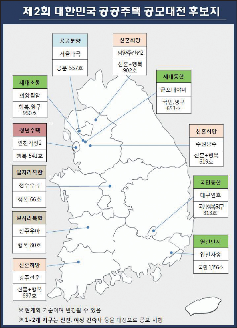 공모 대상지구는 신혼희망타운과 행복주택 등 다양한 유형을 선정했다. 또 지역별 특성을 도출할 수 있게 전국에서 사업지를 확정했다. 해당 단지들은 2020년에 착공해 이듬해 입주자를 모집한 뒤 2022년 준공을 목표로 하고 있다.