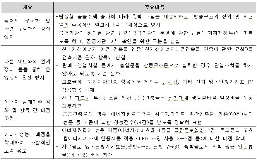 금번에 개정되는 주요 내용으로는 탑상형 아파트가 증가함에 따라 측벽의 개념을 재정의하고, 신재생에너지의 이용을 확대하기 위해 풍력발전설비, 지열히트펌프 용량 등 새로운 에너지성능 평가항목을 신설했다. 또한, 공공건축물의 경우 에너지효율등급을 취득했더라도 동 기준에 의한 일정 수준 이상의 성능점수를 받도록 하여 보다 엄격한 평가를 통해 에너지 절약에 선도적인 모범을 보이도록 하였다. 현 에너지성능지표 점수는 민간건축물은 60점, 공공건축물 74점 이상 의무 취득해야 한다.