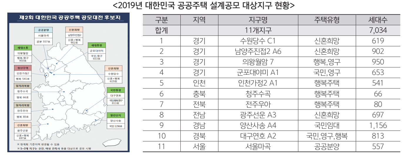 LH는 지난 6월 16일 보도자료를 통해 올해 설계공모대전에서 공모대상 사업지구 규모를 작년 대비 약 2배 증가한 11개 지구, 총 7천 호로 확대하고, 기존의 단지별 설계를 확장해 주변단지·이웃과 공유할 수 있는 공원, 편의시설 등을 추가로 계획하는 것을 설계지침에 반영할 예정이라고 밝힌 바 있다. 설계공모 1등에게는 지구 설계권이 부여되며, 지구별로 2등 3천만원, 3등 2천만원, 4∼5등 각각 1천만원 보상이 이뤄진다. 작년 공모경쟁률은 34.2대 1에 달했다.