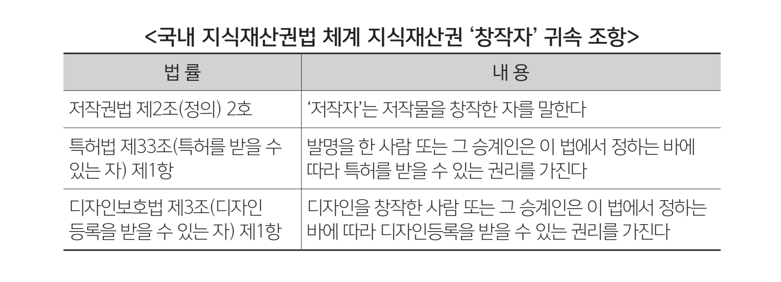 건축에 작용되는 지식재산권적 유형은 저작권, 특허권, 디자인권이다. 지식재산권법 체계상 ▲ 저작권법 ▲ 특허법 ▲ 디자인보호법을 적용받는다. 이들 법에서 건축설계창작물의 지식재산권이 누구에게 귀속되는지에 대한 법률적 근거를 살펴보면, 건축설계창작물과 직접 연관된 국내 지식재산권법 체계는 하나같이 ‘건축설계창작물을 창작한 자’를 창작자로 규정하고, 창작자에게 그 권리가 부여된다는 점을 분명히 하고 있다.