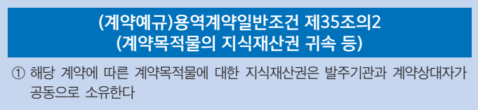 다만, 계약예규는 지식재산권 중 특허권, 실용신안권, 디자인권에 대해 계약의 목적, 개발의 기여도, 기술개발 결과물의 활용 및 사업화를 고려해 계약당사자간 협의를 통해 귀속주체를 정할 수 있도록 특례를 둔다.