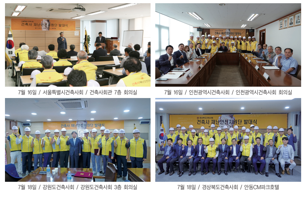 이번 호에서는 지난 호(306호)에 이어 7월 16일 이후 개최된 전국 시·도 ‘재난안전지원단 발대식’ 현장 모습을 소개한다. 이후 8월 2일 개최되는 제주특별자치시건축사회의 발대식을 끝으로 전국 17개 시도의 발대식이 모두 완료된다.