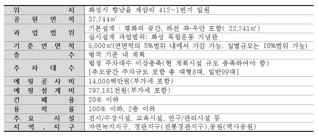 한편 오는 8월 20일 오후 3시 응모업체 대표자 또는 위임받은 자를 대상으로 현장설명회가 열린다. 장소는 화성시 향남읍 제암리 화성 3.1운동 순국유적지 교육관이다. 이날 오후 1시부터 5시까지는 예외적으로 현장접수도 가능하다.