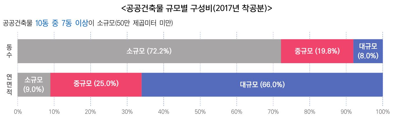 더욱이 이 규정들은 공사비 100억 원 이상인 건설공사에만 적용하도록(시행령 제67조2항) 되어 있다. 대규모 사업의 비중이 큰 토목공사를 대상으로 만든 법률이기 때문이다. 그러나 건축공사는 사정이 전혀 다르다. 2013∼2017 5개년 평균 연간 착공 공공건축 9,000동 중 공사비 100억 원 이상(약 5,000제곱미터 이상)은 240동으로 2.7%에 불과하다. 공공건축공사 중 97% 이상이 100억 원 이하라는 얘기다. 이들의 절차와 기준은 무엇으로 관리해야 할까.