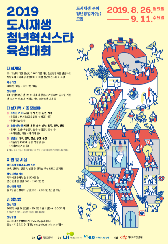 국토부는 한국토지주택공사(LH), 주택도시보증공사(HUG)와 공동으로 도시재생 분야의 청년창업가를 발굴하고, 실제 사업화할 수 있도록 지원하는 ‘2019 도시재생 청년혁신스타 육성대회’를 개최한다고 8월 25일 밝혔다.