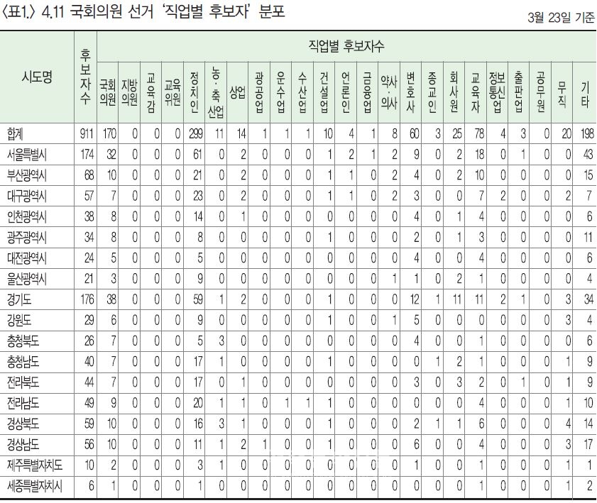 중앙선거관리위원회는 지난 3월 23일 후보자 등록을 마치고 후보자 927명을 공개했다. 이번 국회의원 선거 후보자를 직업별로 살펴보면, 정치인이 306명(33%)이 가장 많았으며, 다음으로 국회의원 170명(18.3%), 교육자 78명(8.41%), 변호사 60명(6.4%) 순이었다. 후보자 중 변호사를 비롯해 건설업 근무자 10명, 약사·의사 6명으로, 전문직 후보 등록이 눈에 띄는데 반해 건축사는 후보자 중에 없었다. 비례대표에서도 마찬가지다. 정당 별 비례대표 총 188명 중 전문직 후보자는 변호사 4명, 의사 2명, 약사 1명, 간호사 1명으로 파악됐다.