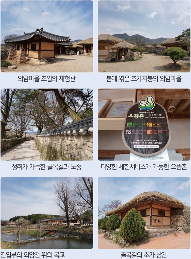 마을을 들어가는 곳은 주차장에서 매표를 한 후 다리를 건너가야 마주할 수 있다. 사과나무가 자리한 옆 다리를 건너 마을로 들어간다. 이 다리 밑은 외암천이 흐른다. 외암천 하부에도 작은 목교가 있으나 메인 진입이라기보다는 사진 찍는 장소에 가깝다. 이곳을 지나면 민속관이 자리한다. 다양한 민속 관련 물건들과 체험이 이루어진다. 메인 도로로 들어가면 외암 팜스테이 마을처럼 외암천을 따라 외암마을 민박까지 시원한 하천 바람을 따라 정취를 즐길 수 있다. 설화산이 보이는 가을빛도 달라짐을 알 수 있다. 민속관에서 골목을 따라 오르는 길은 어릴 적 추억이 가득한 우리네 삶의 담장들과 초가집, 기와집, 늘 있던 노송과 야생화들로 가득하다. 참다운 가을빛을 느낄 수 있다.