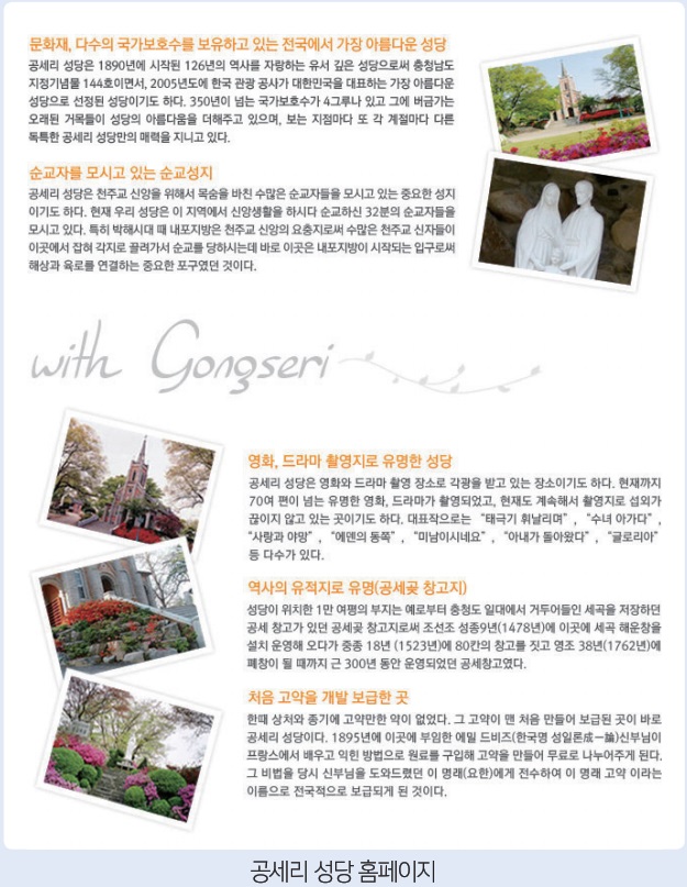 이곳 공세리 성당은 70여 편의 영화가 상영되기도 한 곳으로도 유명하다. 프란치스코 교황이 아산지역의 솔뫼성지를 방문하게 된 것 또한, 이 지역이 종교적 관심이 많은 곳이기 때문이다. 가을에 특히 아름다운 공세리 성당을 둘러보는 것을 추천한다.