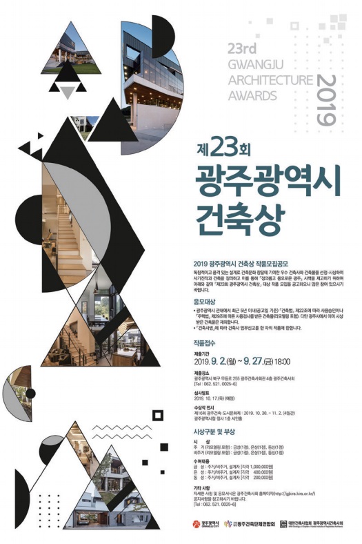 광주광역시건축사회 주관, (사)광주건축단체연합회가 주최하는 제23회 광주광역시 건축상 공모가 시작됐다. 광주광역시건축사회는 8월 12일 공고를 통해 관내 우수한 건축사와 건축물을 선정하는 광주시 건축상 공모를 진행한다고 밝혔다. 응모 대상은 건축사 업무등록을 한 자의 작품으로 공고일 기준 최근 5년 이내 관내에서 사용승인된 주거, 비주거 건축물에 한한다. 자세한 내용은 광주광역시건축사회홈페이지(gjkira.kira.or.kr) 공지사항에서 확인할 수 있으며, 접수는 9월 2일부터 27일까지 방문접수하면 된다. 공모된 작품은 2주간 현장심사를 거쳐 주거부문과 비주거부문 각각 금·은·동상 총 6작품을 선정, 해당 건축주에게 상패와 상금을 수여할 예정이다. 시공자에게는 상패, 건축주에게는 동판이 전달되며 입상작은 오는 10월 30일부터 11월 2일까지 광주광역시청 시민홀에서 열리는 ‘광주건축·도시문화제’에서 시민들에게 공개될 예정이다.