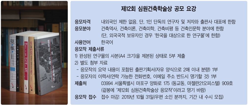 건축계에는 잘 지은 건축물에 수여하는 여러 종의 ‘건축상’이 헤아릴 수 없이 많지만 건축의 인문적 배경의 연구물에 가치를 부여하여 시상하는 제도는 여전히 낯설고 관심 또한 미약하다. 건축설계를 주업으로 하는 건축사들에 비해 상대적으로 주목되지 못하는 건축역사이론가들의 수적 열세는 이 분야의 전망을 흐리게 하는 요인이 될뿐더러 건축지식 생산 시스템의 결함을 방조하는 것이 아닐 수 없다. 저들을 향한 지원 사업이 현행 과학재단과 학술재단 및 건축학회 등에서 이루어지는 것 외에 민간차원에서는 전무하며 그나마 신진 연구자들을 위한 기회는 상대적으로 적다. 건축이론과 역사, 미학과 비평분야의 신진 학자와 연구자들 및 예비 저자들을 대상으로 우수한 연구물을 발굴하여 출판 지원을 하자는 발의로 출발한 심원건축학술상은 매년 응모작 가운데 1편의 연구물을 선정하여 1천만 원의 상금(고료) 및 출판을 지원해오고 있다.