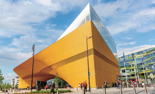 마찬가지로 공공부문에 적용되는 디지털 교육 공간으로 헬싱키 중앙도서관인 오디(Oodi)도 큰 주목을 받고 있다. 일반적인 개념의 도서관이 아니라 새로운 유형의 IT 기술이 지루한 도서관을 보다 활기찬 멀티미디어 복합문화 공간으로 변모시킨 것이다. 이 도서관은 사이버 공간과 현실 공간을 통합하고 자율주행 로봇 사서가 일하고 있으며, 가상 및 증강현실 등을 경험하고 교육할 수 있는 다목적 공간 또한 마련하고 있다.