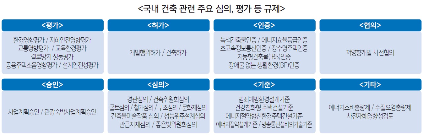 사실 건축계에서 건축 관련 심의와 인허가 제도에 대한 불만은 어제 오늘 일이 아니다. 기본적으로 공공성의 차원에서 심의가 필요하다고 생각하지만, 최근 필자가 진행하고 있는 프로젝트 때문에 평소 심의를 하는 입장에서 심의를 받는 입장이 되고 보니 다분히 주관적이고 규정에 없는 의견에 휘둘리는 것에 대해 황당함과 좌절을 느끼기까지 하였다. 예를 들어 심의대상인 시설이 범죄예방환경디자인(CPTED) 심의 대상이 아니라서 담당공무원에게 문의한 후 심의자료에 넣지 않았는데, 그 분야 전문 심의위원이 사전검토의견을 9개나 낸 후 심의장에서 답변자료가 불충분하다고 강하게 의견을 개진한 경우도 있었고, 건축사의 고유 디자인이라 할 수 있는 입면에 대해 디자인은 좋은데 재료가 너무 많으니 2개로 줄이라는, 납득하기 힘든 의견까지 있었다. 물론 공정하고 합리적인 의견을 제시하는 심의위원들이 대다수이지만 간혹 이러한 심의위원들 때문에 사업 지연, 사업 백지화 등 엄청난 피해가 생기는 경우가 많고 이로 인해 건축사사무소도 불이익을 당하는 경우가 허다하다.