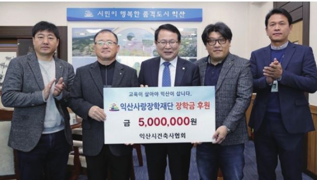 전라북도건축사회 익산지역건축사회가 11월 22일 지역 인재육성을 위한 장학금 500만원을 (재)익산사랑장학재단에 기탁했다. 김경태 익산지역건축사회장은 “지역인구가 감소하는 상황에서 다자녀 장학금이 신설, 지원되는 모습을 보고 회원들과 뜻을 모은 성금을 장학금으로 기탁하게 됐다”면서 “작은 도움 이나마 지역인재 양성에 도움이 되기를 바란다”고 밝혔다.