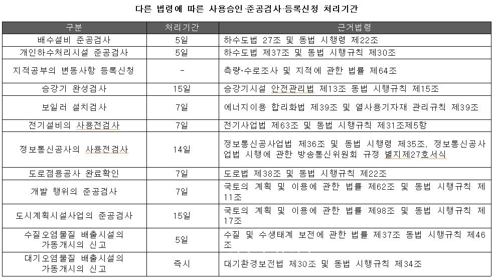 그동안 건축물의 사용승인 신청과 별도로 개별 법령에 따른 사용승인, 준공검사 등을 받아야 함에 따라 많은 시간과 경비가 소요되어 건축주에게 불편이 있었으나, 이번 「건축법 시행규칙」개정으로 이러한 문제가 해소될 전망이다.