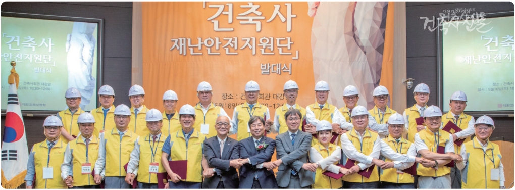 대한건축사협회가 5월 16일 ‘건축사재난안전 지원단 발대식’을 갖고 건축전문가로서 건축물 안전점검, 보수·보강 방법 자문 등 역할을 수행하기로 했다. 4월 발생한 강원도 화재 참사와 관련해 대한건축사협회는 5월 7일 ‘강원도’와 재난 발생 시 복구지원을 약속하는 내용의 업무협약을 체결하고 성금 1억 3800만원을 전달하는 등 재난 대응활동에 박차를 가했다. 이 같은 활동 속에 재난안전지원단의 출범은 건축사들의 구호 활동을 조직화해 보다 체계적인 지원 활동을 펼치려는 데 의미가 있다. 중앙에 이어 전국 시·도건축사회에서 재난안전지원단 발대식이 6∼7월 동안 연이어 진행됐으며, 행정안전부는 10월 30일 ‘재난관리자원의 분류 및 시스템 이용에 관한 규정’을 일부 개정하고, 재난관리자원 인력부분에 대한건축사협회 재난안전지원단 팀을 신규로 추가해 고시했다.