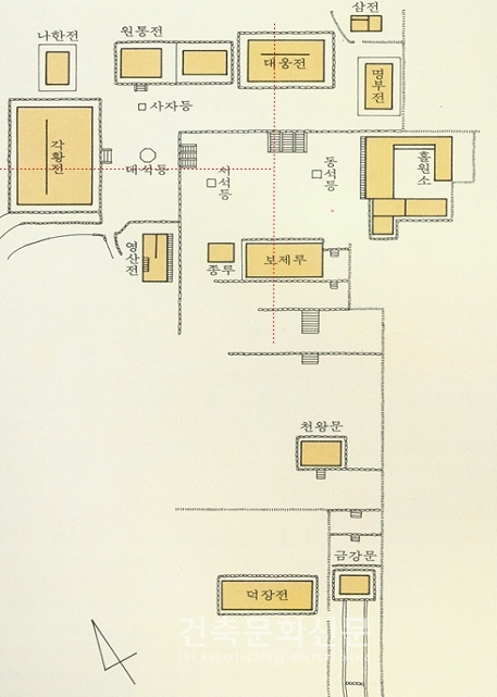 그러나 우리나라 사대부 주택이나 관공서 전각건축에서는 대개 2개 이상의 축을 쓴다. 앞서 설명한 바 있지만, 전통건축에는 안채와 사랑채처럼 대개 2개의 주제가 존재한다. 하나는 정신적 지주가 되는 몸통(體-사실은 머리)이고 다른 하나는 외부로 나타나는 얼굴(相-사실은 몸통)이다. 이들을 모두 일직선 축으로 배치하는 경우도 있지만, 대개는 중국과 다르게 2개의 축을 써서 별도의 공간 얼개-음악적 율동-을 구성한다. 심지어는 2개의 축을 직교시키는 경우도 가끔 있다. 궁궐같이 큰 집에서는 3개의 축을 쓰는 수도 있다. 대표적인 경우가 경복궁일 것이다. 중심축은 정전이고 동쪽 축은 내전 공간으로 동궁과 대비, 후궁 등의 공간이며 서쪽 축은 경회루가 있는 휴식의 공간이다. 우리의 경우는 이렇게 좌우가 전혀 다른 공간 구성을 하는데 비해서, 중국 자금성의 3개의 축은 완전히 같은 개념의 집들이 일직선으로만 늘어서 있다. 중국은 다만 규모만으로 압도할 뿐이지 전혀 음악적, 영화 같은 극적인 재미는 없다. 만약 피라미드가 작게 만들어졌더라면 어떤 느낌을 줬을까? 생각하면 끔직한 것과 같다. 그래서 이집트 신전들은 수없는 열주들이 서 있다.