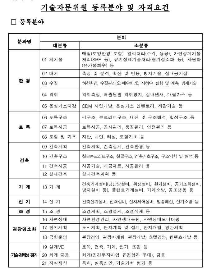 이번에 새롭게 구성되는 자문위원은 신청 받는 후보자를 대상으로 내부 검증 및 평가를 통해 선정하게 된다. 분야 및 위원 수는 ▲건축계획 ▲건축구조 ▲건축시공 ▲실내건축 등을 포함한 건축분야, ▲도시계획 ▲단지계획 및 설계 ▲단지개발 ▲경관계획 등 관광명소화, 설계VE 등 기술경제성 평가를 비롯한 8개 분과이며, 위촉될 위원 수는 250명에서 300명 내외이다.