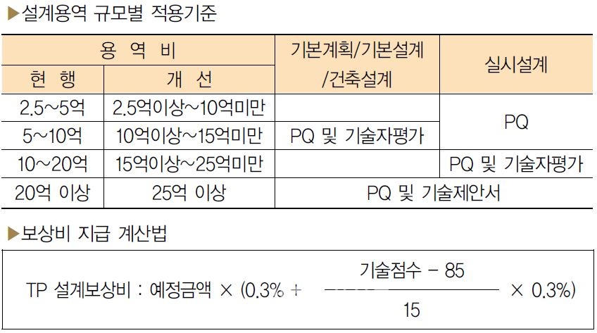 개선안에는 SOQ와 TP 시행 대상 용역비 기준을 각각 5억 원씩 상향 조정, 무분별한 수주 경쟁을 줄인다. 이에 따라 현재 5억∼10억 원인 PQ·SOQ 용역비는 10억~15억 원으로 높아진다. 또 발주처가 심의 편의를 위해 기술제안서 외에 추가 발표자료 작성 요구를 금지하도록 하고, 기술제안서 작성 분량도 현재보다 25% 감축했다. SOQ 및 TP 심사에서 탈락한 상위 3개사에는 용역설계 보상비를 지급하기로 했다.