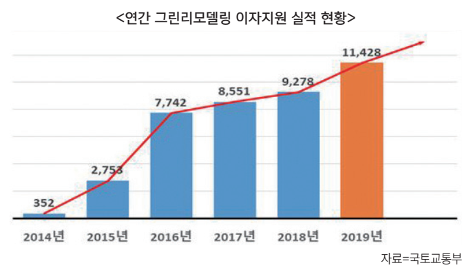 지난 2014년부터 추진 중인 지원사업은 지원규모가 지속적으로 증가해 2019년의 경우 1만 건의 실적을 거둔바 있다. 올해는 1만2,000 건을 목표로 추진할 계획이다. 지원사업 참여자의 경우 5년간 소액으로 갚을 수 있는데다, 대출금 이자까지 지원돼 큰 부담 없이 창호 등 단열을 개선할 수 있어 꾸준히 수요가 높아지고 있다.