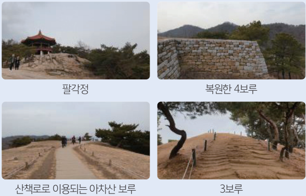 아차산은 아차산성에서 유래한 이름이다. 삼국시대에 고구려의 침략에 대비하기 위해 백제에서 보루로 활용됐던 기록을 보면, 산행을 위한 공간이기 이전에 역사를 간직한 유적지라 할 수 있다. 가벼운 산행을 하면서 백제의 기억을 읽어보는 것도 흥미롭다. 창녕 화왕산성과 같은 산성 형식은 테뫼식이다. 테뫼식 산성이란 산꼭대기를 중심으로 능선을 따라 쌓은 산성을 의미한다. 아차산성을 오르는 길은 지역마다 다양하다. 가장 길게 산행한다 해도 3시간 정도면 아차산과 용마산을 돌아 아차산 둘레길을 지나오기에 충분하다. 지하철 5호선 광나루역에서 출발해 아차산 생태공원을 거쳐 팔각정을 지나 대성암을 지나면 아차산성 보루가 나타난다. 보루의 흔적이 기록된 글을 보면서 다닐 수 있어 좋다.