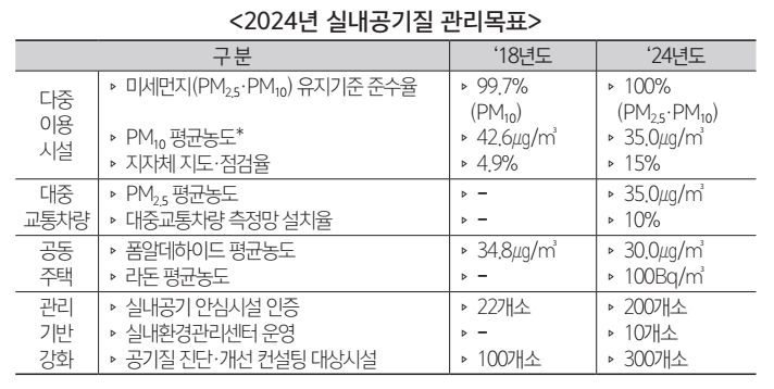 다중이용시설의 공기질 관리수준도 향상된다. 다중이용시설의 미세먼지 대응을 위해 환기설비 설치의무를 확대하고, 필터 성능기준의 단계적 강화 방안을 마련한다는 방침이다. 유치원과 어린이집, 학교 등 민감계층 이용시설도 공기정화설비 설치확대에 따라 유지·관리에 대한 점검을 강화하고, 공기질 측정·개선컨설팅을 통해 실질적인 공기질 관리수준을 높인다.