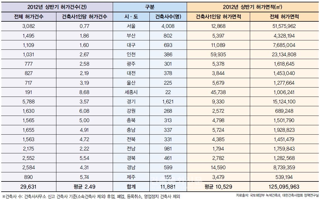 전국 평균 2.49건, 전국 평균면적 10,529㎡ 좋아요0싫어요0후속기사 원해요0 손석원 기자 news@kira.or.kr 다른기사 보기 저작권자 © 대한건축사협회 건축사신문 무단전재 및 재배포 금지 당신만 안 본 뉴스 2025년도 제2회 건축사 자격시험 합격예정자 526명…명단은 14일 국토교통부와 대한건축사협회 누리집에 공고 [수상 그 후] 2025 부산다운건축상 우수상 수상작 ‘어반에그’(유대우 건축사, 유가건축사사무소) 공공성·포용성·지속 가능한 노후주거지 정비 방안은?…“지역에 맞는 개발방식 도입해야” 국토부, 중소건설사 PF 1조 원 규모 유동성 지원 시장 양극화·신규 인력 유입 줄어들며 위기 맞는 건축산업, 지금이 ‘골든타임’ [건축사의 작품노트] 실내외 구분 없이, 마당 공간적으로 감싼 ‘마호가니 카페 강화점’ - 김정숙 건축사·(주)이드 건축사사무소 (인천광역시건축사회) 2026 건설·주택·부동산 경기, ‘제한적 회복세’ 전망 2025년도 제2회 건축사 자격시험 합격예정자 526명…명단은 14일 국토교통부와 대한건축사협회 누리집에 공고 댓글삭제 삭제한 댓글은 다시 복구할 수 없습니다. 그래도 삭제하시겠습니까? 비밀번호 닫기 기사 댓글 0 댓글 접기 댓글입력 권한이 없습니다. 댓글 내용입력 비회원 로그인 이름 비밀번호 댓글 내용입력 댓글쓰기 계정을 선택하시면 로그인·계정인증을 통해 댓글을 남기실 수 있습니다. 회원 로그인 이름 비밀번호 자동등록방지 로그인 옵션 창닫기 주요기사 도시공간 디자인 품격 향상 위한 총괄계획가 지원 사업 공모 국민 안전 위협하는 위반건축물, 사전 예방 위한 규제완화에 ‘기대’ [특별칼럼] 대한건축사협회가 설계공모를 주관하는, 비현실적이지만 아주 상식적인 상상 [사설] 건축사의 눈앞에 직면한 문제해결도 골든타임 ‘2025 대한민국목조건축대전’ 대상에 치유의 집·산림복지종합교육센터 선정 서울특별시건축사회, 서울시건축사회장기 당구대회