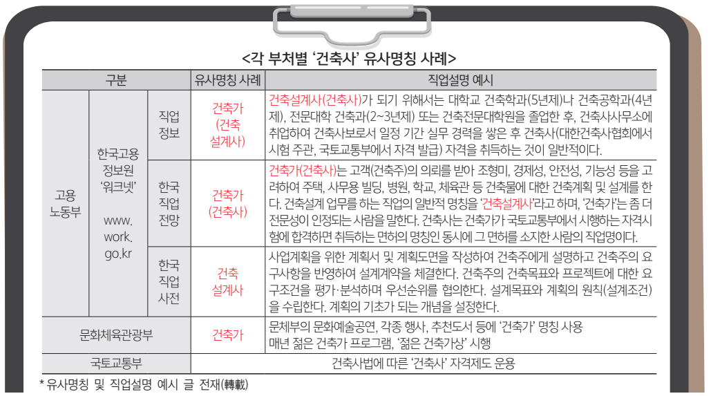 이처럼 법에서 ‘건축사 유사명칭 사용 금지’를 규정하고 있지만, 정부 각 소관부처는 건축사의 명칭, 직능에 대한 해석을 달리해 제멋대로 운영하는 것으로 나타났다. 고용노동부가 운영하는 워크넷(work.go.kr)의 직업정보에서는 건축사 명칭이 ‘건축가(건축설계사)’로, 한국직업전망은 ‘건축가(건축사)’, 한국직업사전은 ‘건축설계사’로 천차만별이다. 설명을 자세히 들여다보면 건축사, 건축가, 건축설계사 간의 경계도 모호하고 헷갈리지만, 해석 또한 엉망이다. 문화체육관광부도 국토교통부와는 별도로 건축사의 직능을 문화의 한 분야로 보고, ‘젊은 건축가상’이라는 건축물 시상제도 등을 운영 중이다.