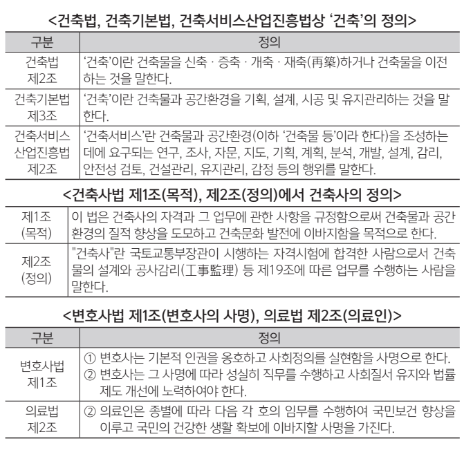 사실 건축사들이 추구하는 직능에 대한 정의도 법제적으로 완전하지 않다. 건축사법은 1962년 1월 20일 건축법이 제정되고 2여 년이 지난, 1963년 12월 16일 제정됐다. 법 제1조 목적에 이어 제2조(정의)에서 ‘건축사’를 “국토교통부장관이 시행하는 자격시험에 합격한 사람으로서 건축물의 설계와 공사감리 등 제19조에 따른 업무를 수행하는 사람을 말한다”로 정의한다.